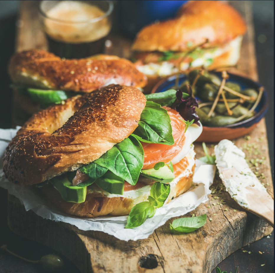 Bagel ai semi di papavero, hummus di ceci, avocado, pomodorini secchi, rucola.