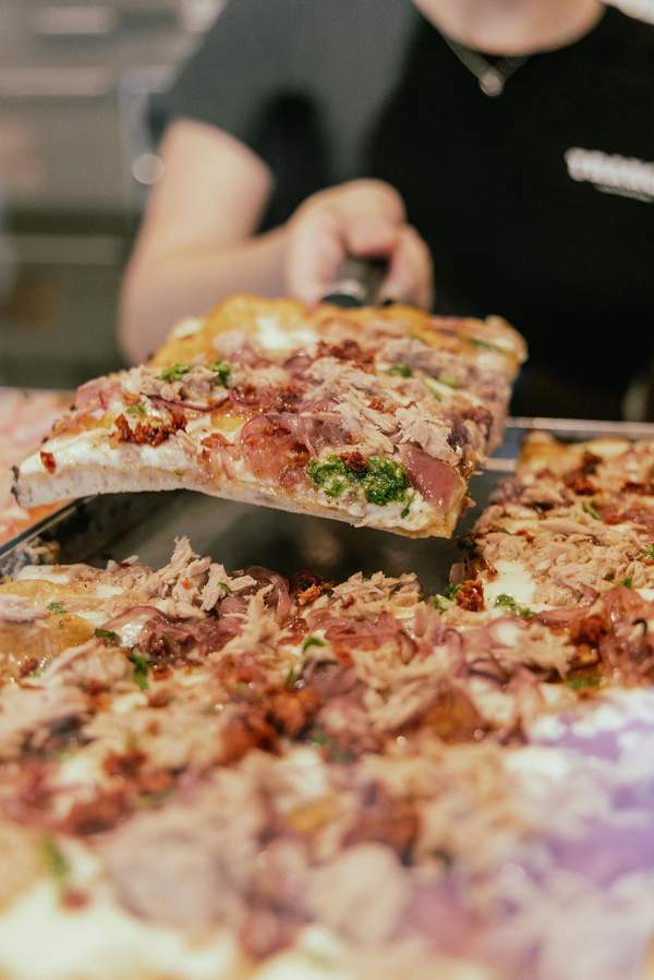 Pomodoro San Marzano, mozzarella fior di latte, salsiccia Napoli piccante, basilico, olio evo
