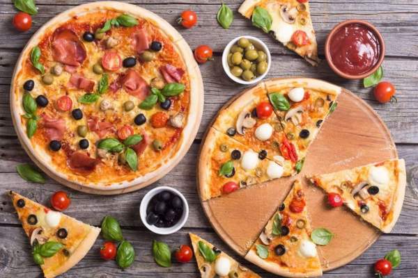 pomodoro, mozzarella, prosciutto, funghi, carciofi, origano e olive
