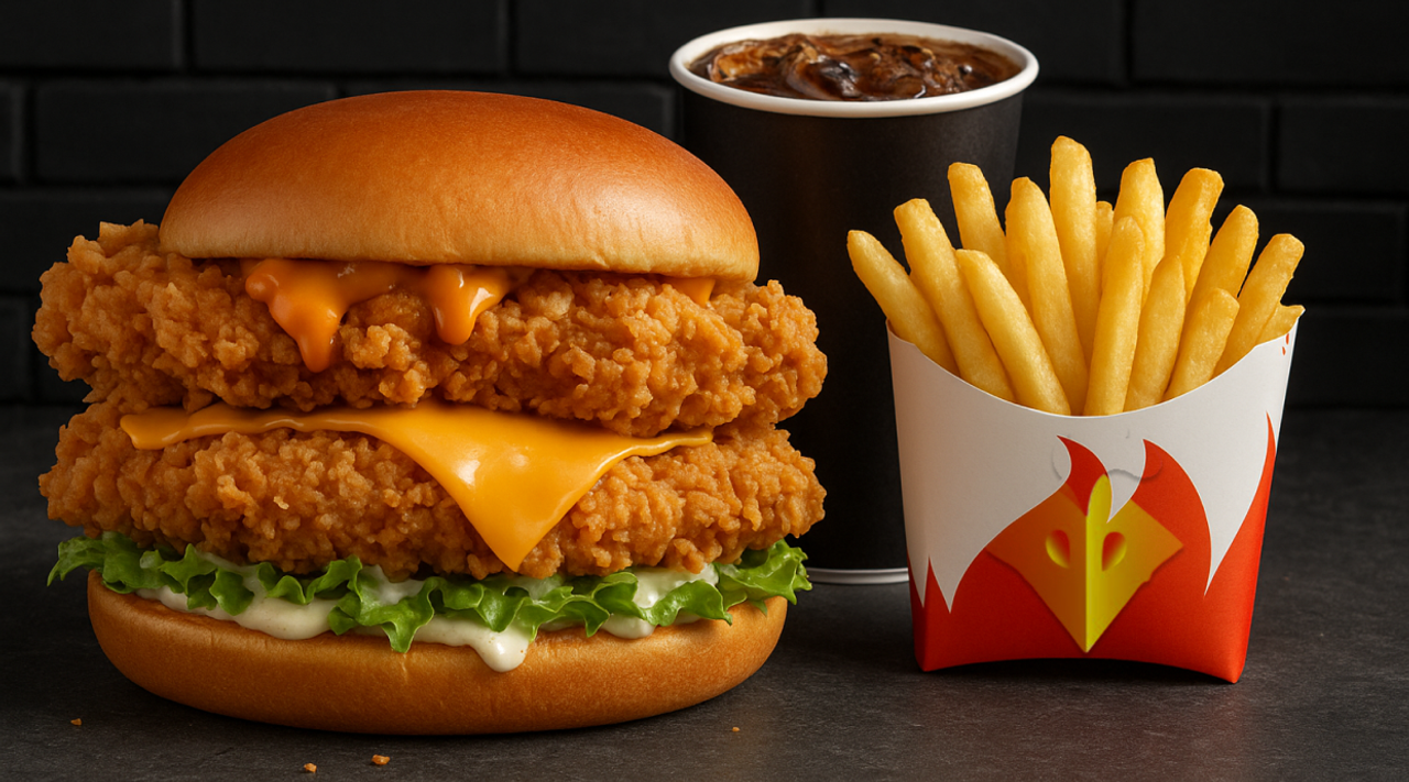 Double Chicken Burger brings twice the satisfaction with extra patties stacked high with delicious toppings.