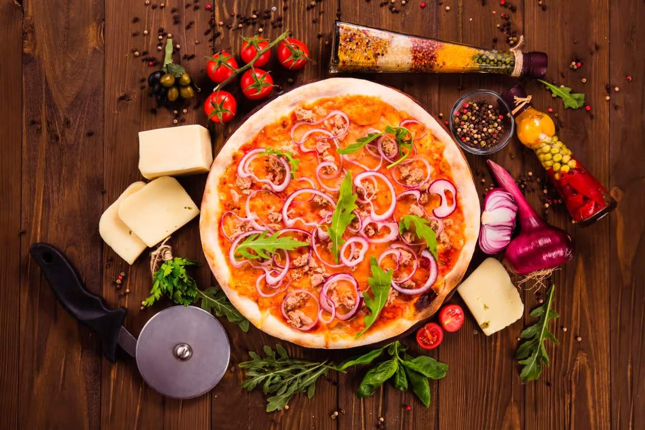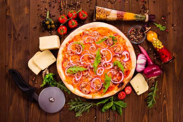 Тесто, говяжий фарш, лук, помидоры, петрушка, томаты