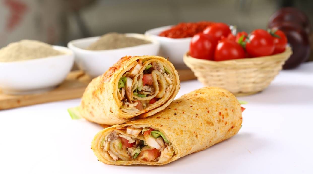 обжаренное на вертикальном гриле мясо курицы в лаваше приправленное овощами и соусами