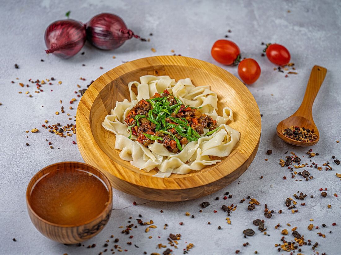 Традиционное блюдо с широкой лапшой и отварной кониной.
