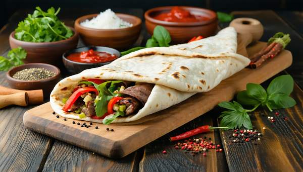 Микс мяса и овощей, завернутый в ароматный сырный лаваш.