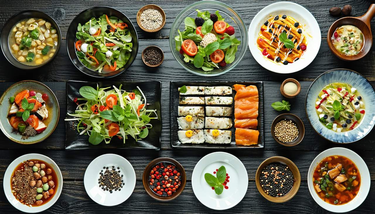 Микс Салата, Перепелиные Яйца, Помидоры Черри, Мини Стейк Из Лосося, Кунжут