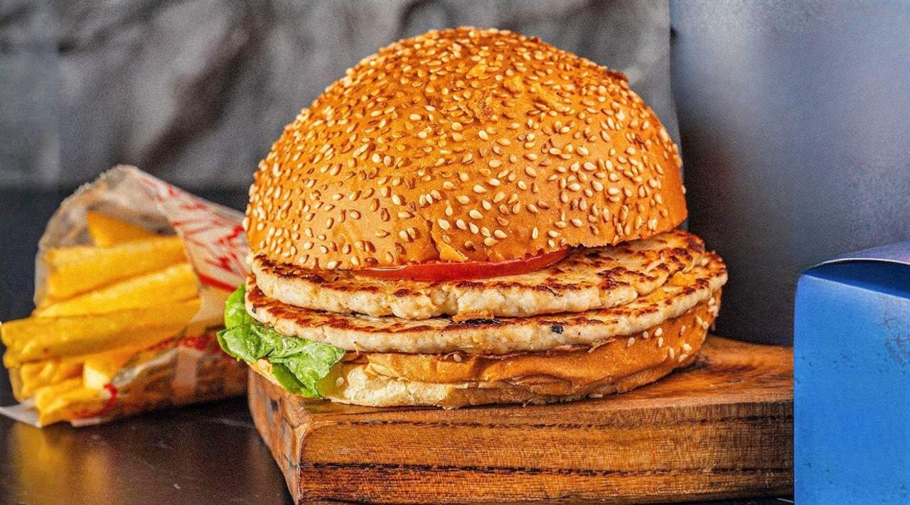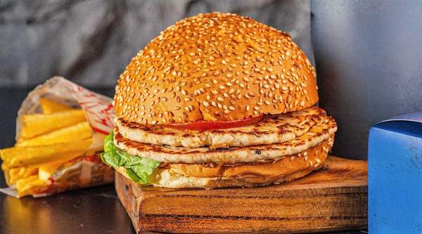 Бургер из пышной булочки с кунжутом с двумя сочным фирменными котлетами из куриного фарша, листьями салата и соусом "Тартар"