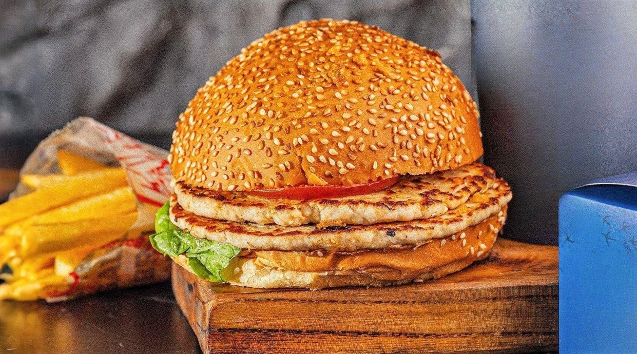 Бургер из пышной булочки с кунжутом с двумя сочным фирменными котлетами из куриного фарша, листьями салата и соусом "Тартар"