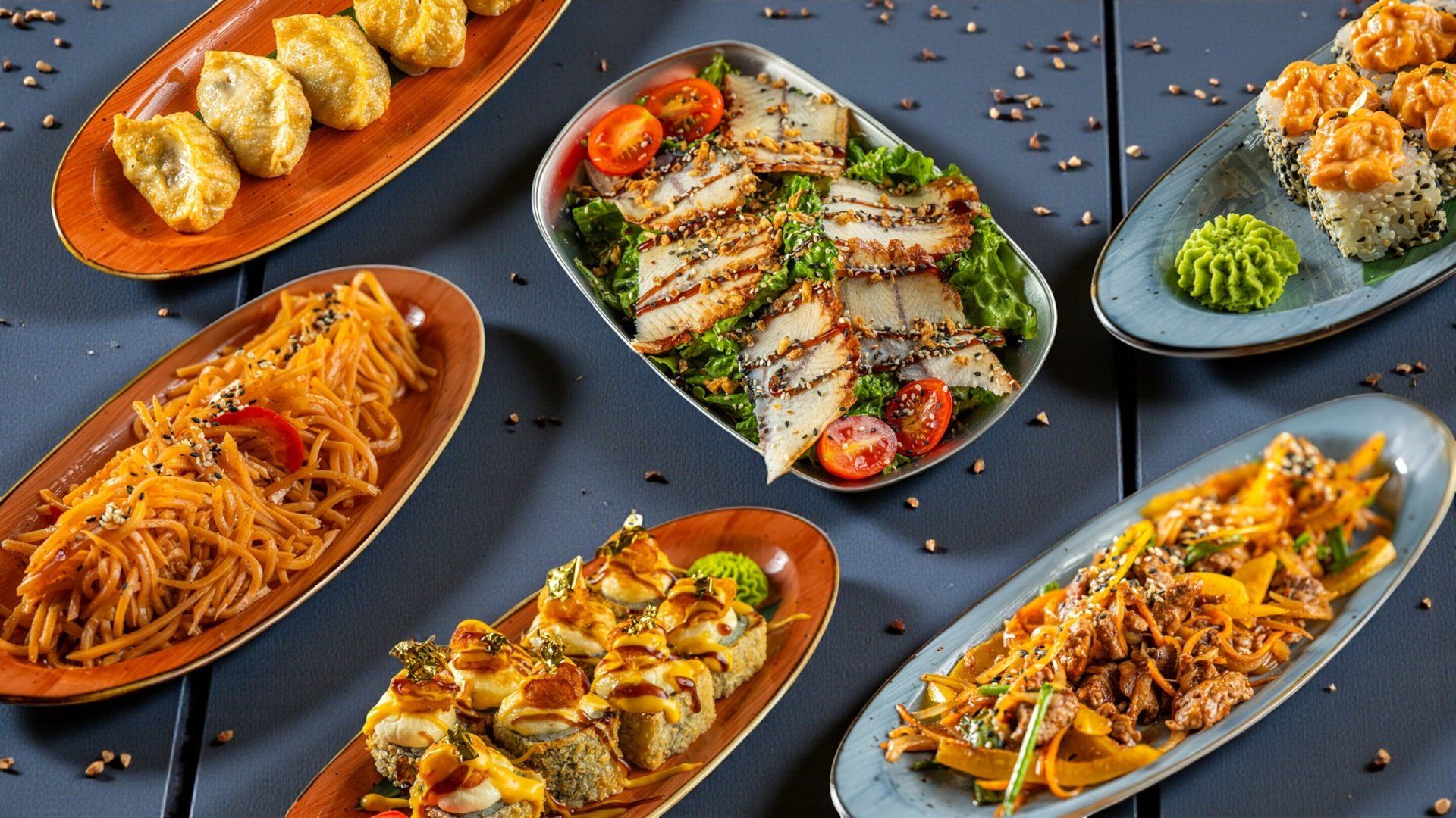 Креветки в панировке, сяке каппа маки, салат кимчи, удон с курицей