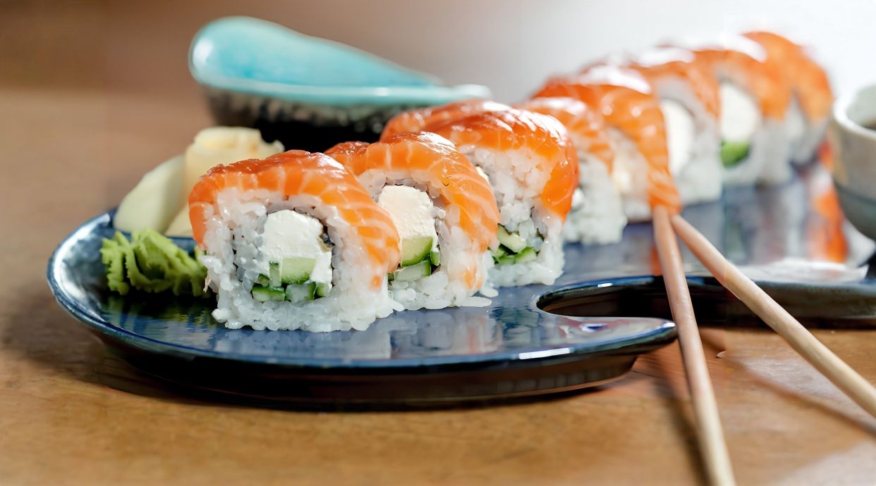 Рис, нори, лосось, огурец, авокадо