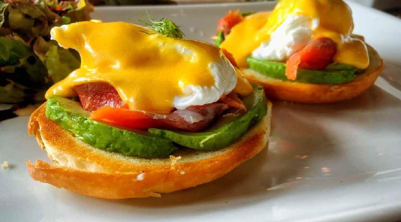 Легкий завтрак на основе брускетты со слабосоленой семгой "Гравлакс" и яйцом пашот, залитой нежным соусом Голландез, в сочетании с вялеными помидорами черри.