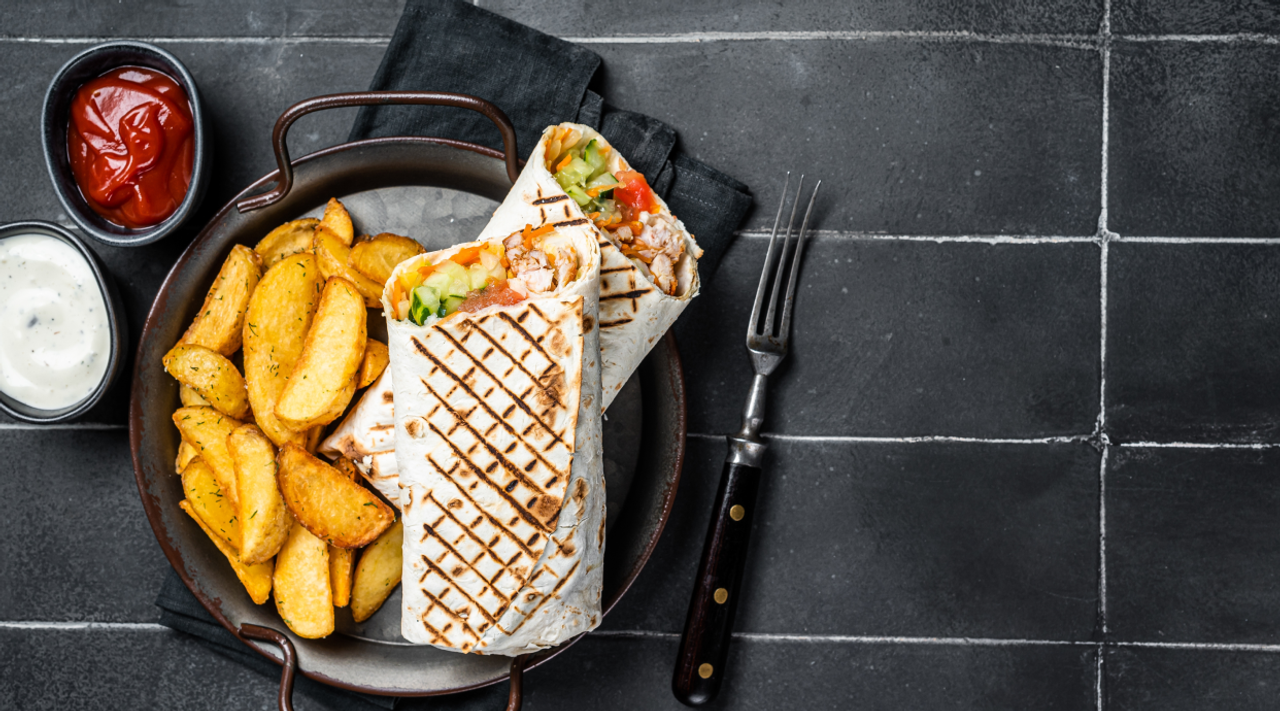 Сочное мясо курицы и говядины на вертеле, свежие огурцы, а так же свежий салат с зеленью и фирменный соус, завернутый в лаваш, фри, напиток и соус на выбор