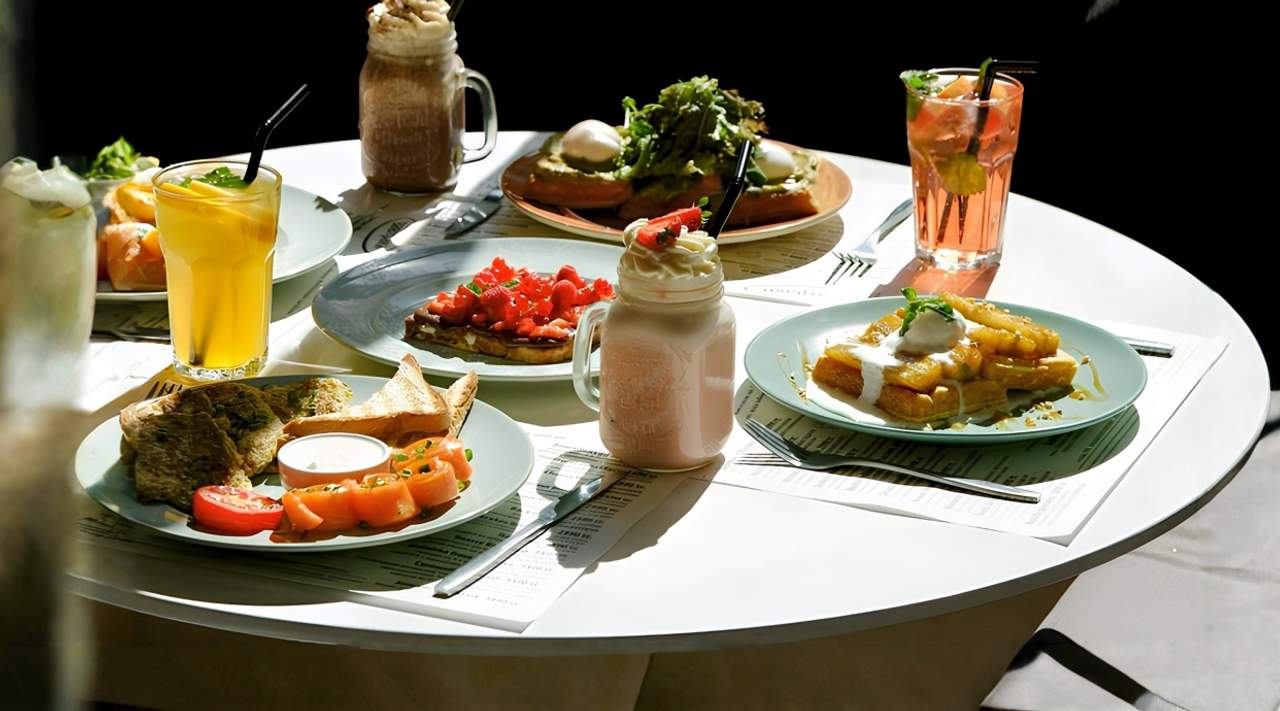 Сытный завтрак с креветками, обжаренными с грейпфрутом на домашнем хлебе со скрамблом из двух яиц и кремчизом