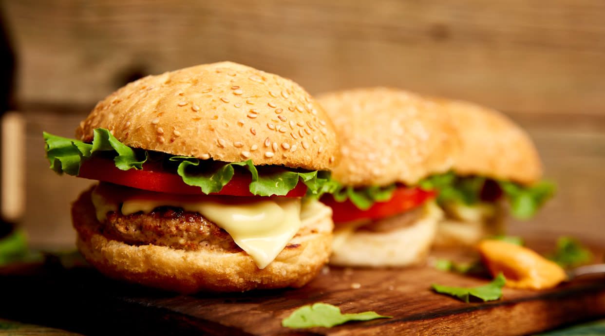 Печеная булочка собственного производства, говядина рубленая, помидор, лист салата, фирменный соус