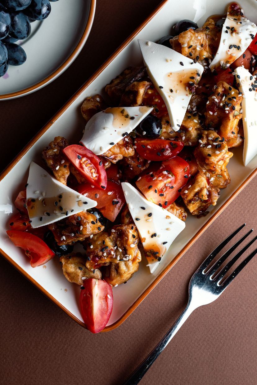 Баклажаны, клубника, черри, помидор, творожный сыр, остро соевый соус