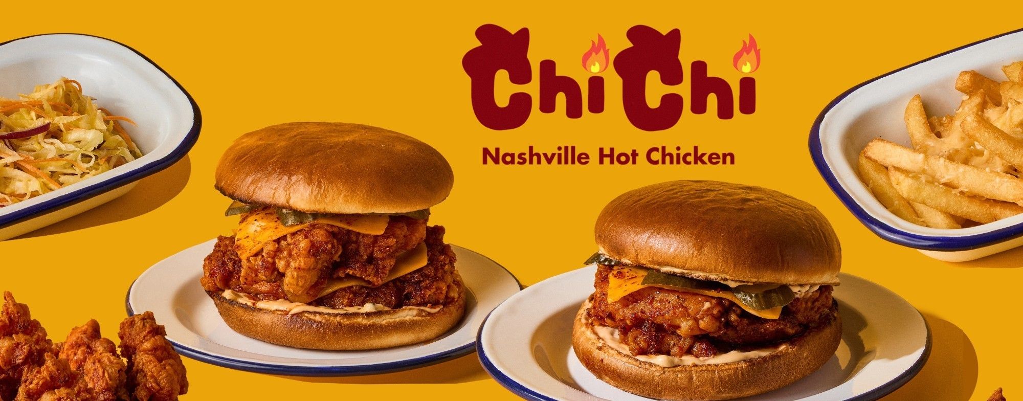 Булочка бриош, куриное бедро, сыр чеддер, огурцы соленые, острый соус.