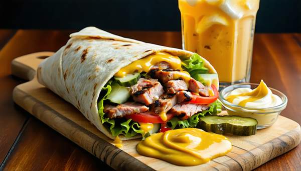 Смешанное мясо из говядины и курицы заворачиваются в лаваш с сыром и с фирменными соусами и запекается в печке