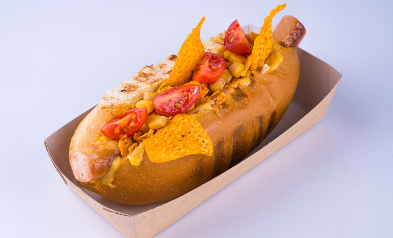 Мексиканская сальса, острый соус Шрирача, говяжья колбаска, хрустящая булочка, сыр, красный маринованный лук, лук в панировке