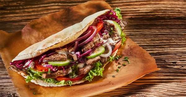 Говядина, бараний фарш в тесте, соус - йогурт, помидор, огурец, лук репчатый