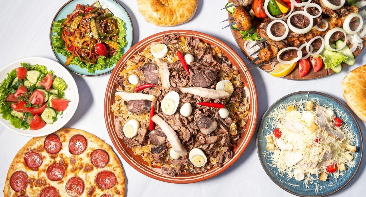 Плов ташкентский 1кг., ачу чук 1пор., пицца маргарита 1шт., пицца пепперони 1шт., баурсаки 20шт., компот 2л