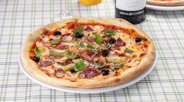 Томаты, салями (не халяль), ветчина из говядины, бекон, маслины, Моцарелла, артишоки, грибы, базилик
