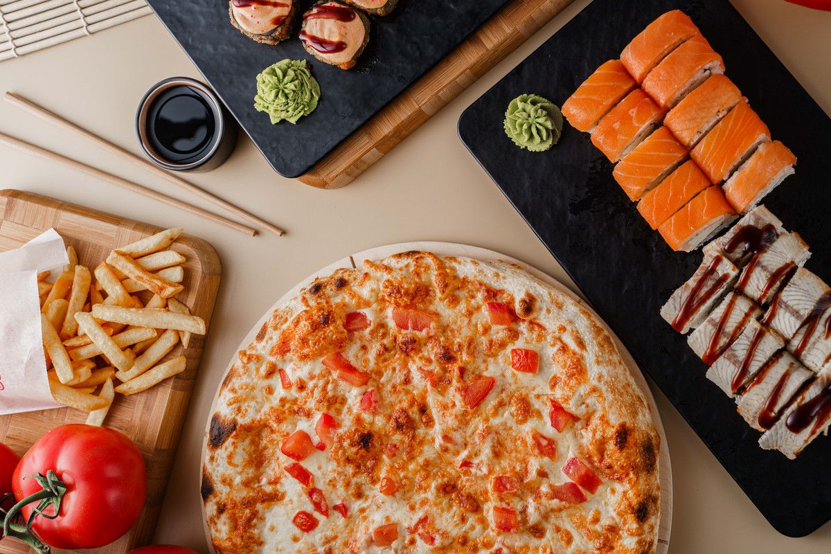 Пицца: Курица с грибами 1шт, Пепперони 1шт, Филадельфия 10шт, Цезарь темпура 10шт, Калифорния 10шт, Унаги маки 10шт, фри 1 порция, Кола 1л