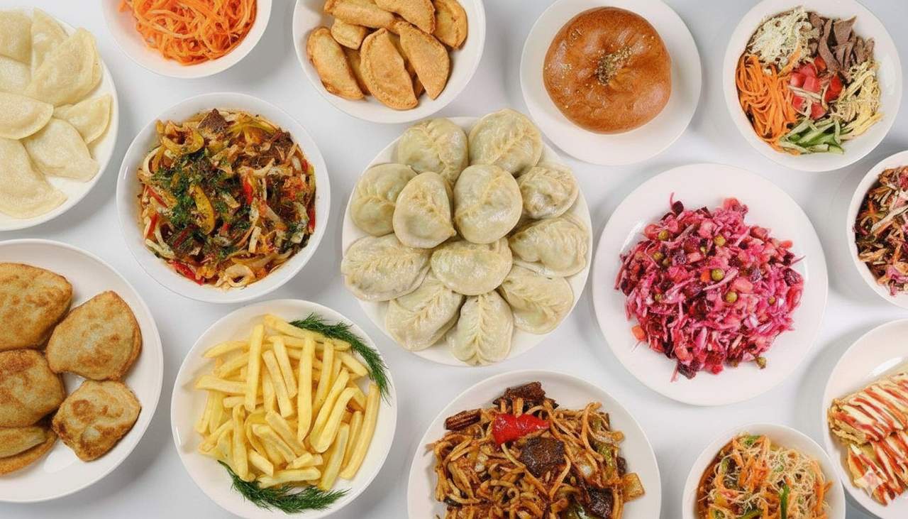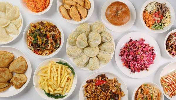 Манты домашние -5шт ,Манты с фаршем и картофелем -5шт ,Пельмени -350гр , Вареники-350гр ,соус сацибели-1,соус чесночный -1, салат морковча 200гр ,компот или каркаде на выбор-1,5л