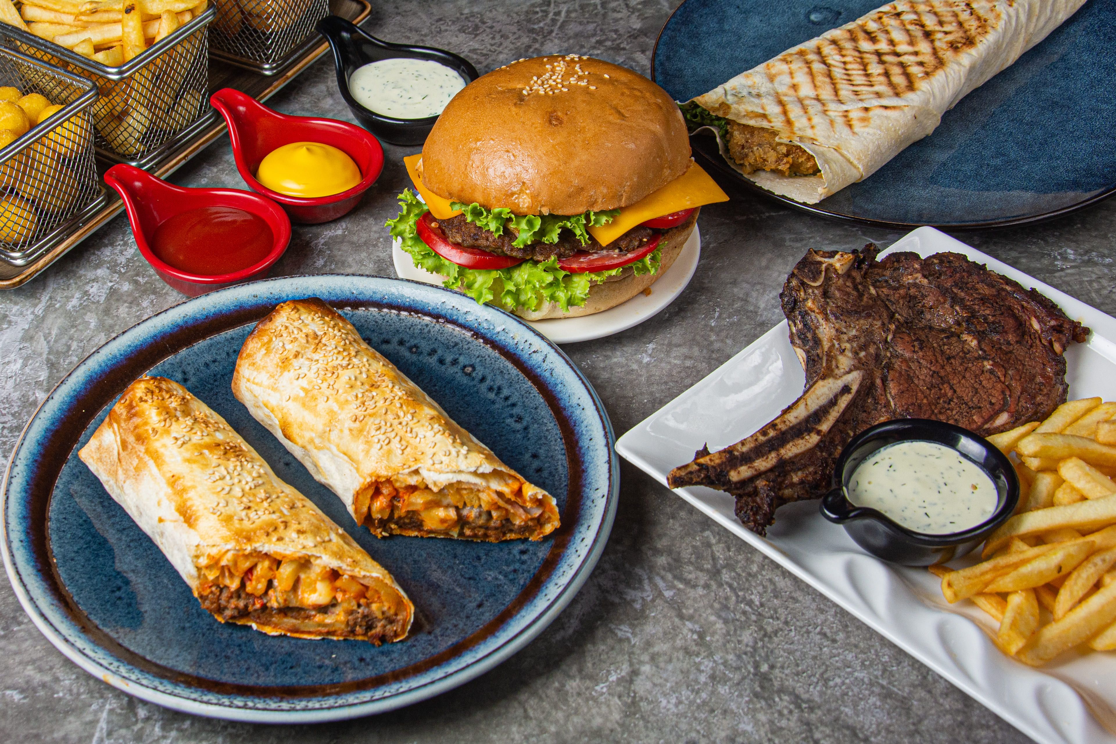 Рубленная говяжья котлета, лаваш, картофель жаренный, острый соус, майонез, помидоры, маринованные огурцы, сыр сулугуни, яйцо, кунжут