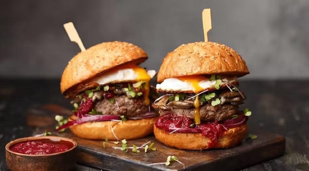 2 котлеты говяжьи, 2 сыра, помидор, лолло-росса, 2 вида соуса