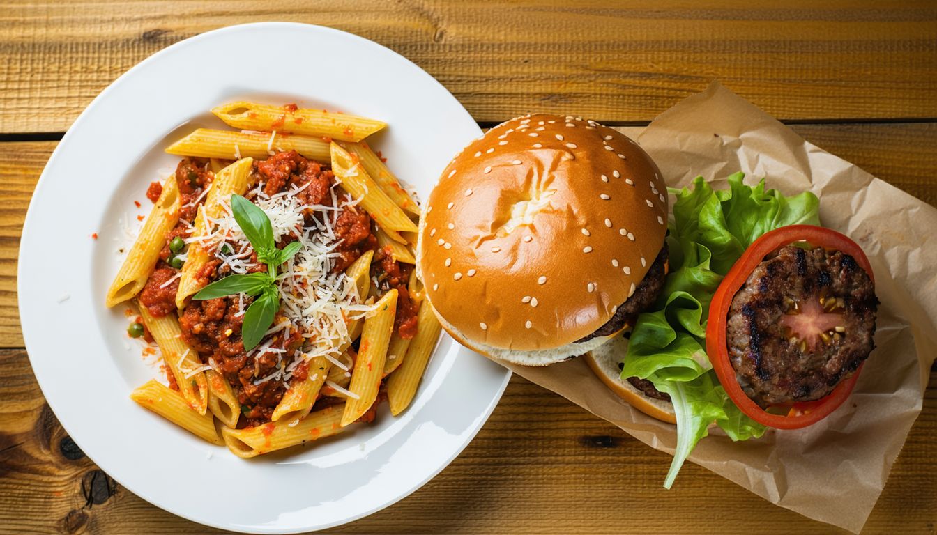 Pain bun's, viande hachée, cheddar, salade, tomate, oignon rouge, cornichon, sauce burger, servi avec des frites maison