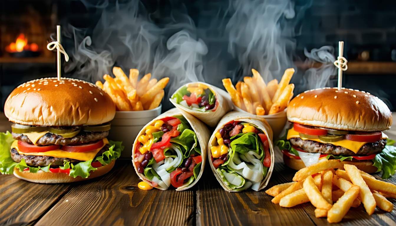 2 big steaks, salade, tomates, oignons, 2 cheddars