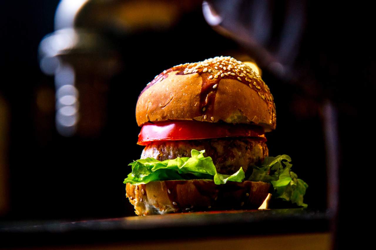 Chiflă, pârjoală dublă de vită, dublu cheddar, muștar american, iceberg, ceapă roșie, roșie, castraveți murați, sos crem-BBQ-420