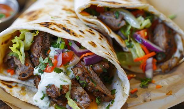 Lavaș, carne de vita, cartofi prăjiți, castraveți murați,ceapa,varza sos 450 g