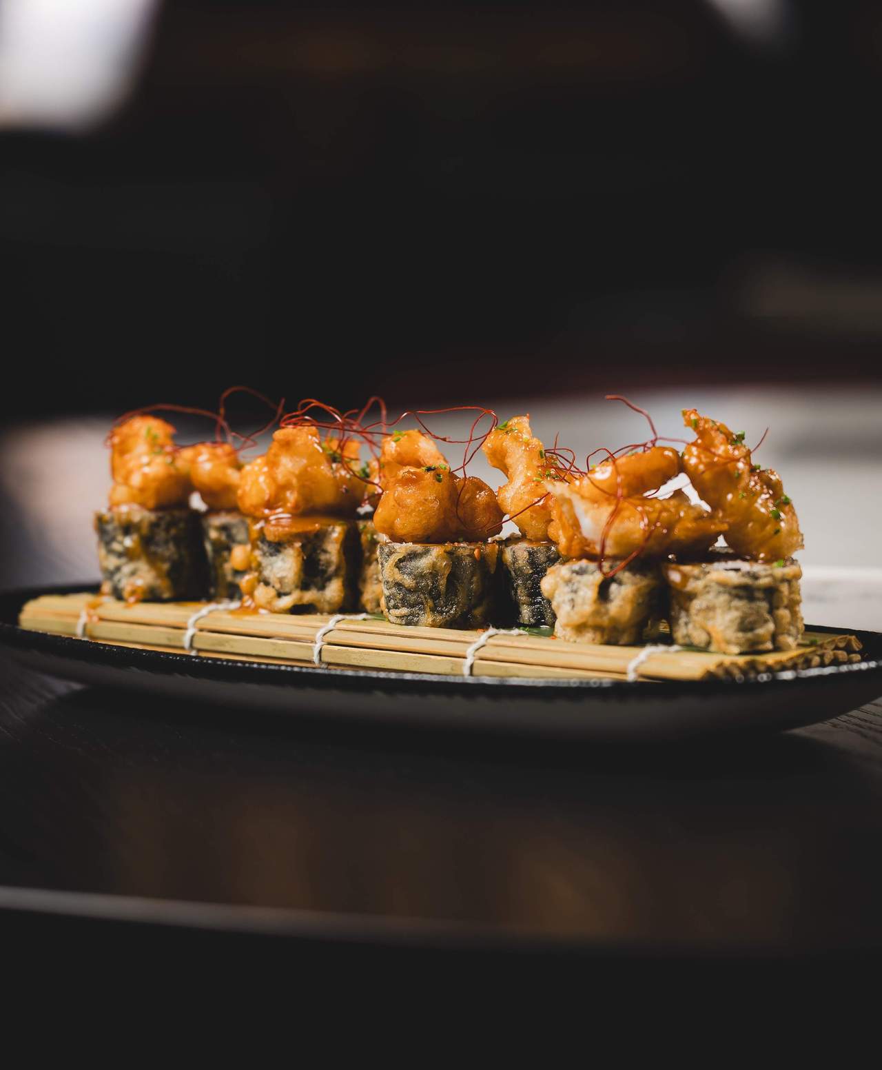 Tempura od gambora, tartar od žutorepa tune, avocado, ukiseljeni krastavac, yuzu majonez, kremasti ljuti majonez, bijeli susam, hrskavi tanuki, morska so, maslinovo ulje