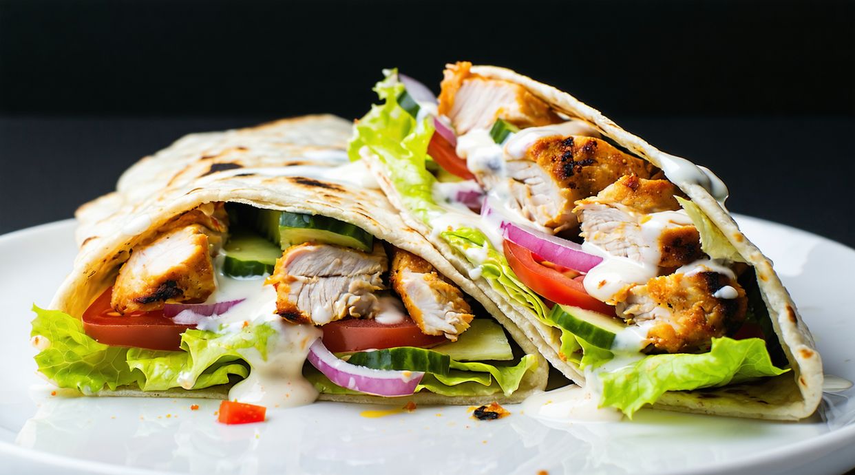 A satisfying shawarma wrap with two seasoned chicken sausages, prepared in soft flatbread.
