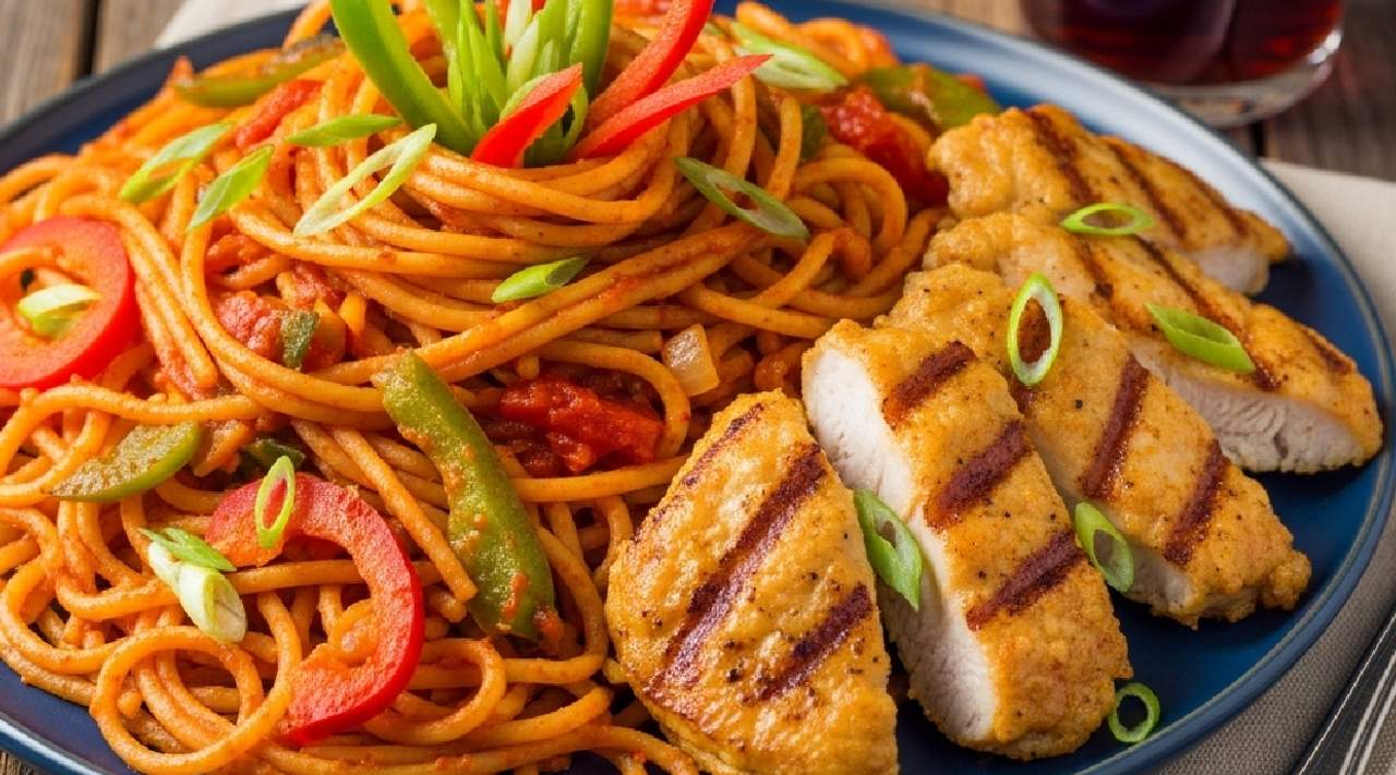 Flavourful jollof rice with tender grilled chicken