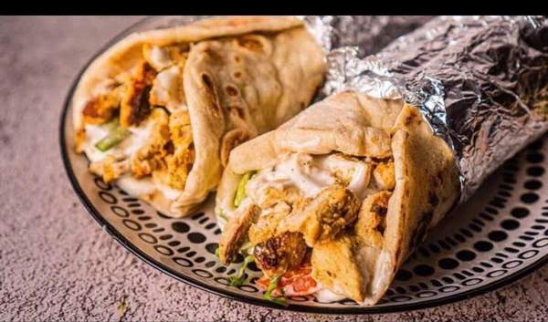 A wrap of shawarma with double chicken, and Single sausages filling with one & half portions