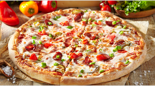 z serem, cebulą, bekonem, kawałkami kurczaka, kukurydzą i papryką świeżą