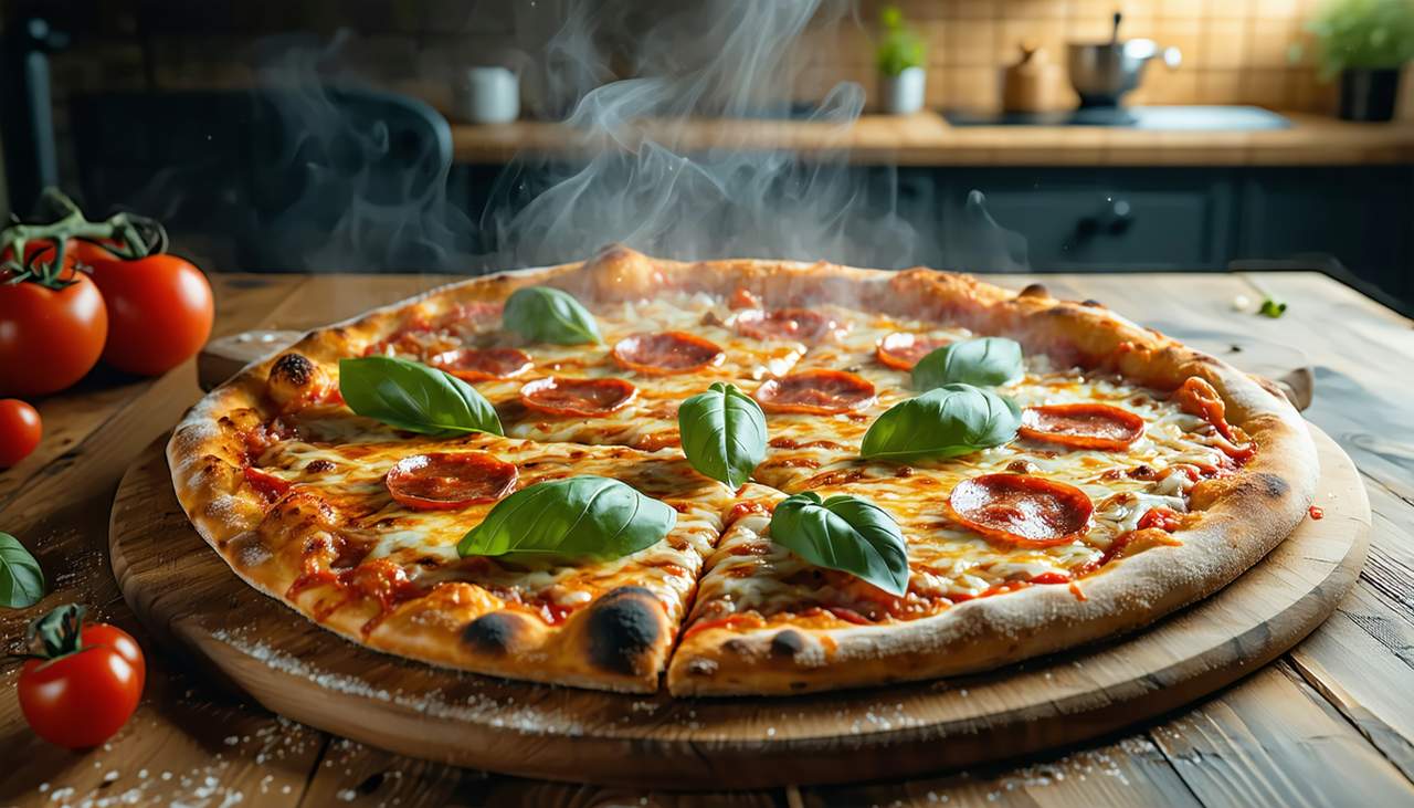 Ciasto, sos pomidorowy, ser, szynka, kabanosy, boczek wędzony, salami, oregano