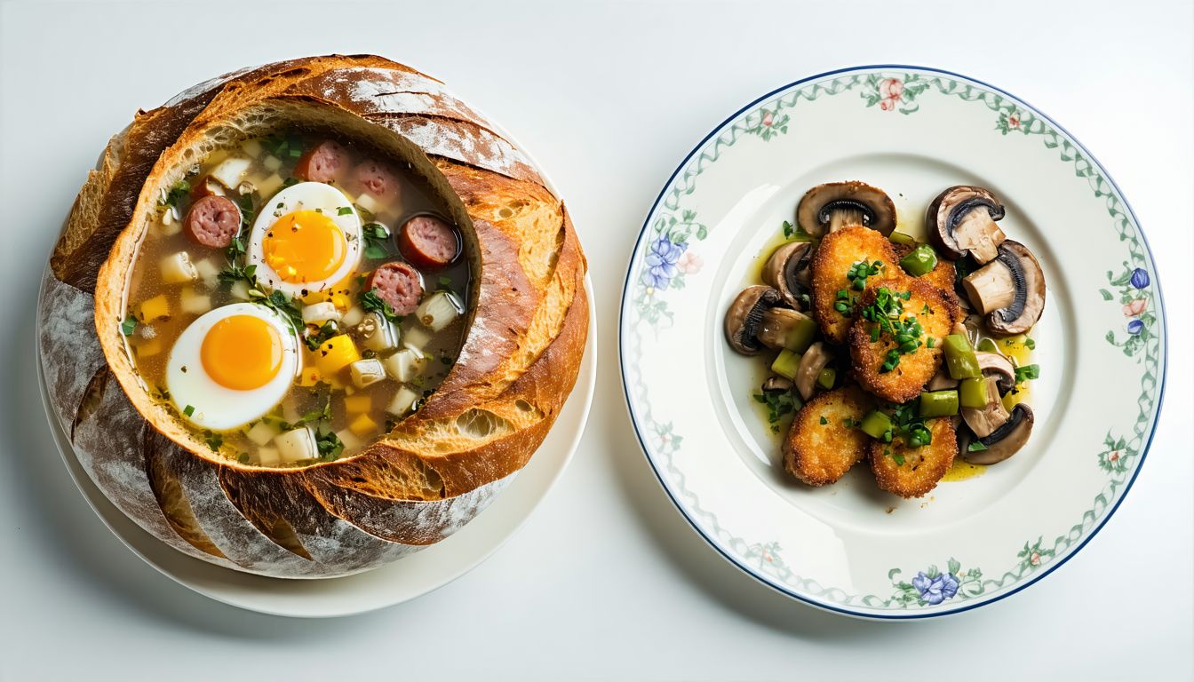 Żurek, biała kiełbasa, boczek, cebula, czosnek, jajko, ziemniaki puree, grzyby
