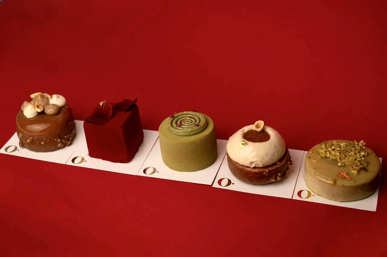 Financier pistacjowy, marcepan, pralina pistacjowa, mus pistacjowy