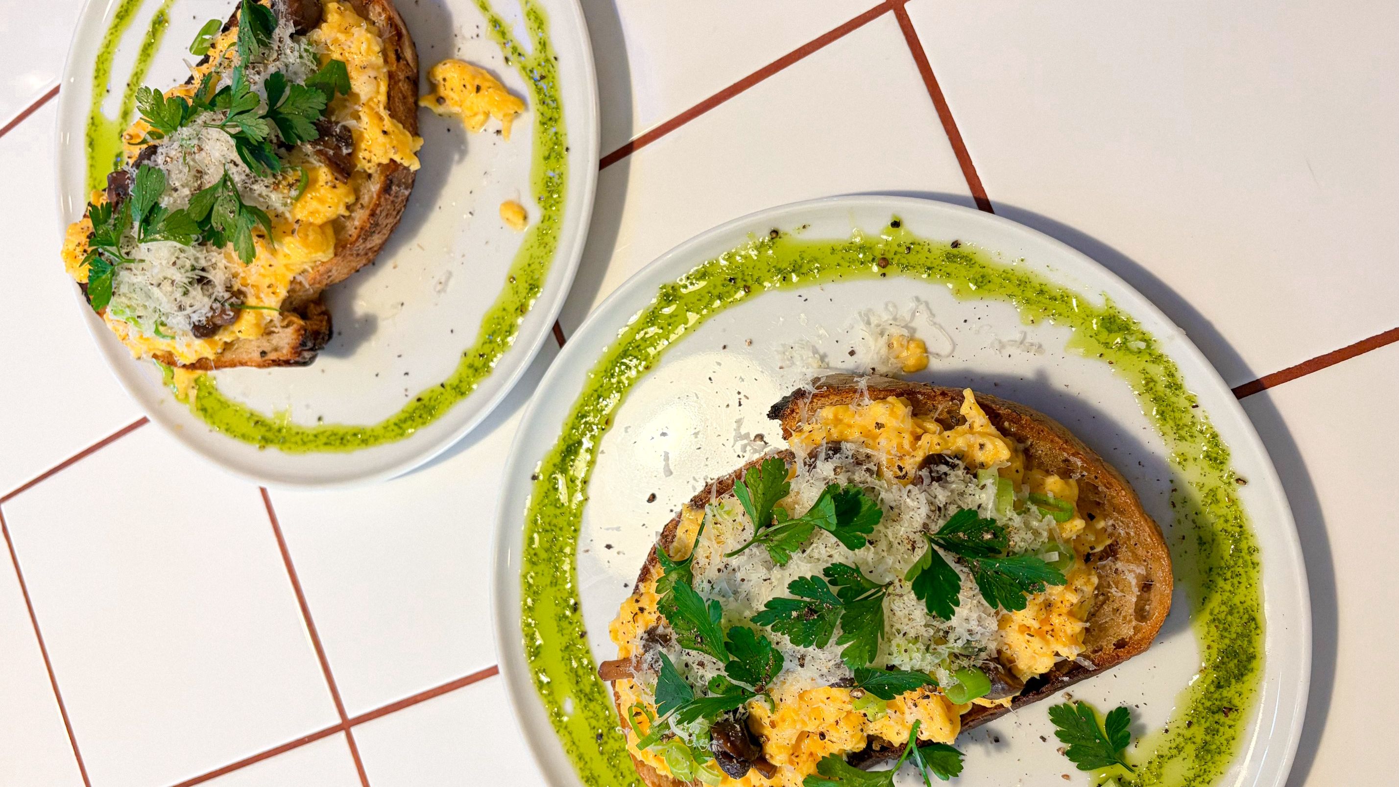 3 jaja, grzanka, marynowane pieczarki, ser Piast, zioła, oliwa pietruszkowa *dostępne w opcji bezglutenowej
