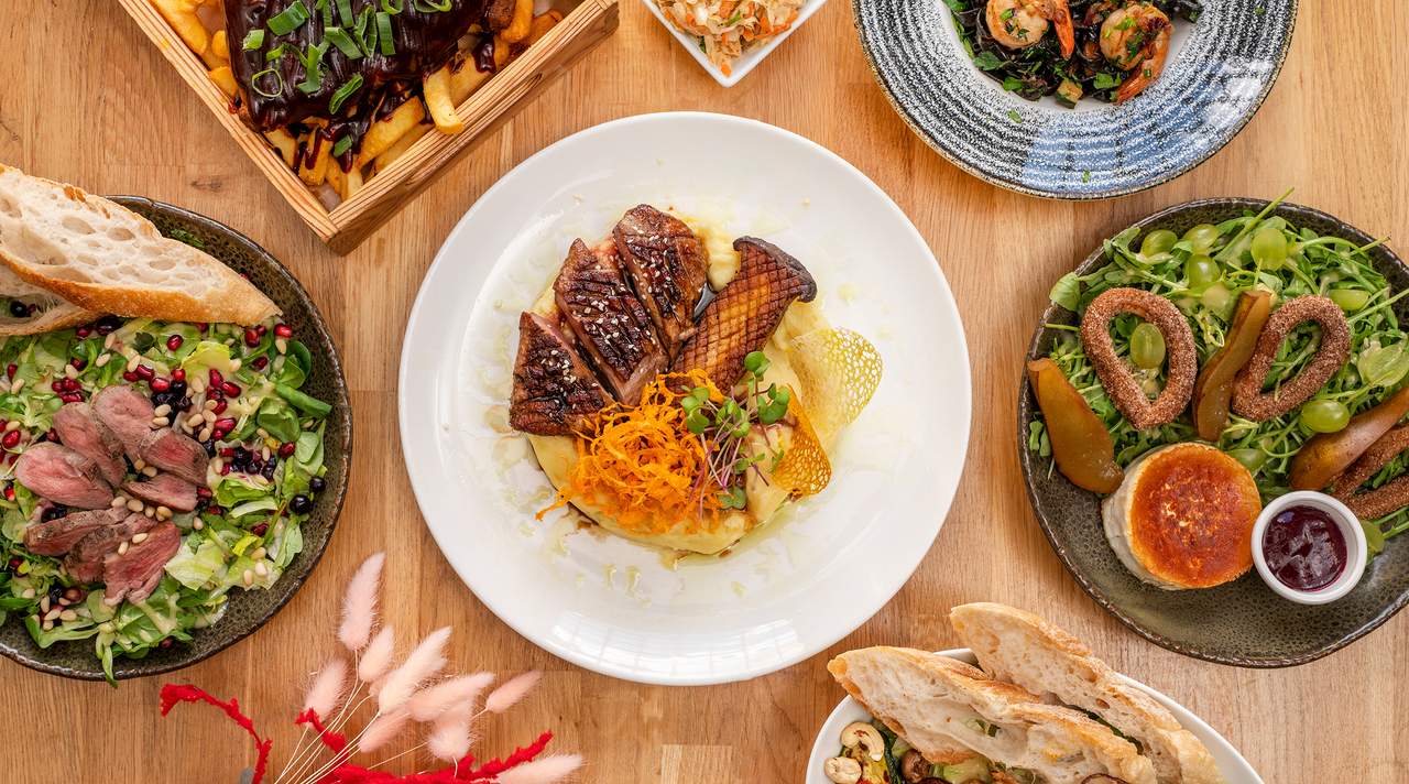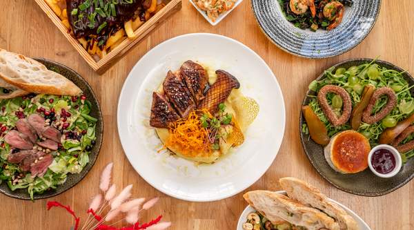 Filet z kaczki, mix sałat, czarna porzeczka, orzeszki piniowe, granat, vinaigrette orzechowy