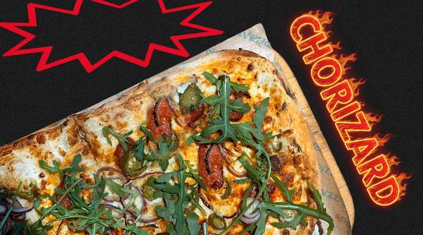 Ciasto klasyczne, sos śmietanowy mozzarella, kiełbasa chorizo, cebula jalapeño, rukola, Oliwa chilli