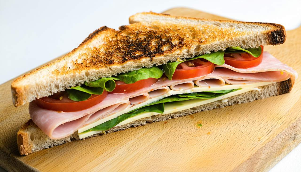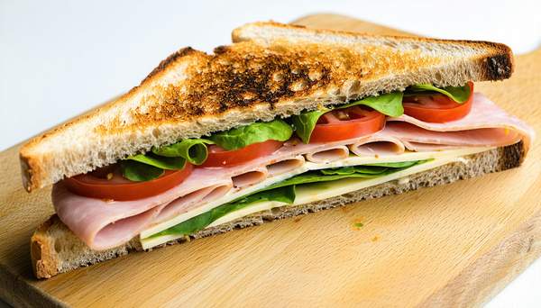 Tradycyjna kanapka z masłem kiełbasą z szynki, serem żółtym, pomidorem, ogórkiem i zieloną sałatą oraz sosem tatarskim