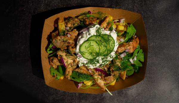 Frytki z gyrosem z kurczaka, rukolą i sosem tzatziki. Wszystkie opcje dostępne w wersji na ostro