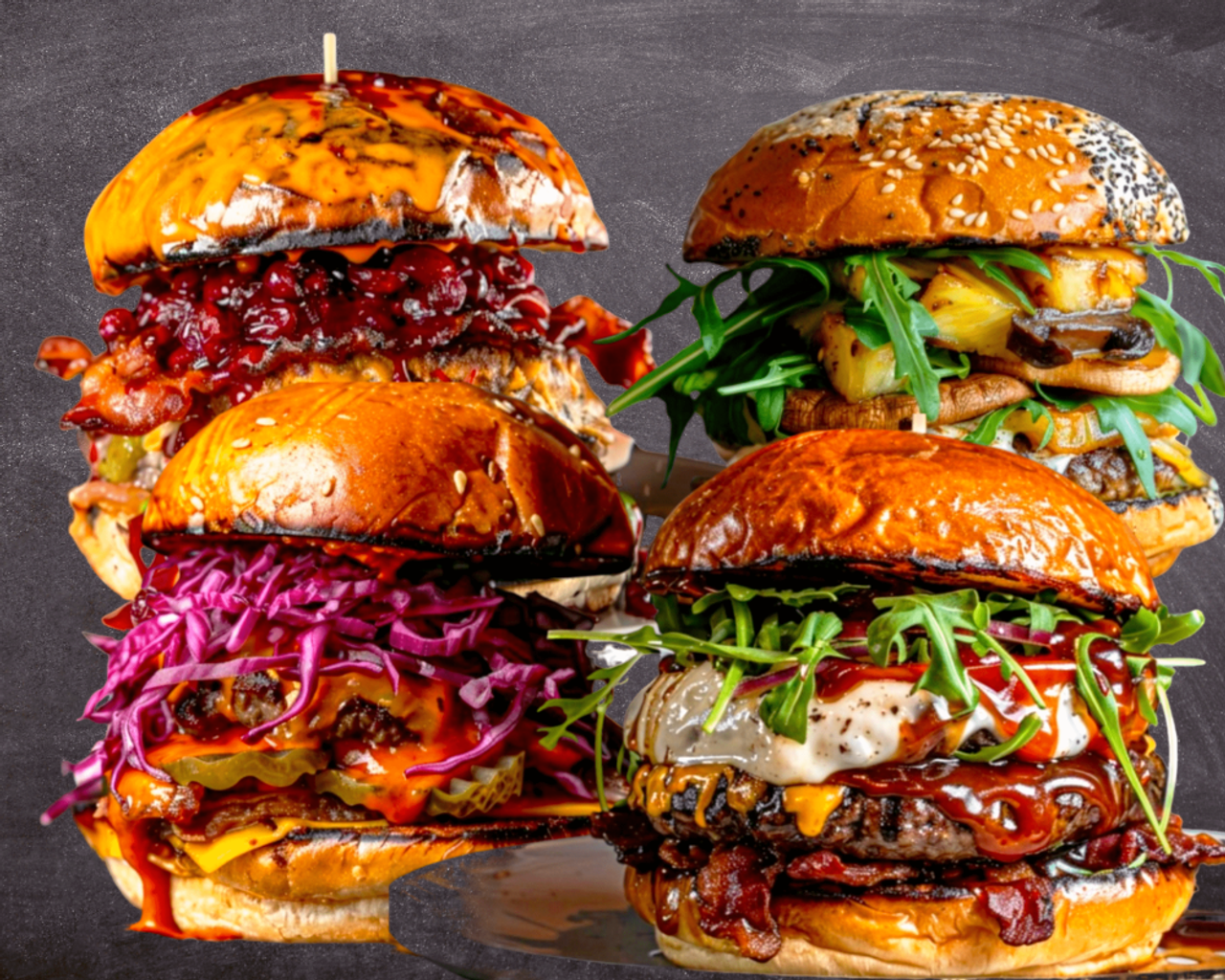 Mięso do wyboru, sos BBQ Bull's-Eye, ser camembert, mozzarella x2,ser cheddar, boczek x2, sos musztardowo-miodowy, rukola.