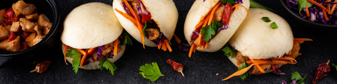 Duża bułeczka bao z chrupiącym kurczakiem, kimchi, sałata rzymska, biała rzodkiew, kolendra, sos alioli, sezam.