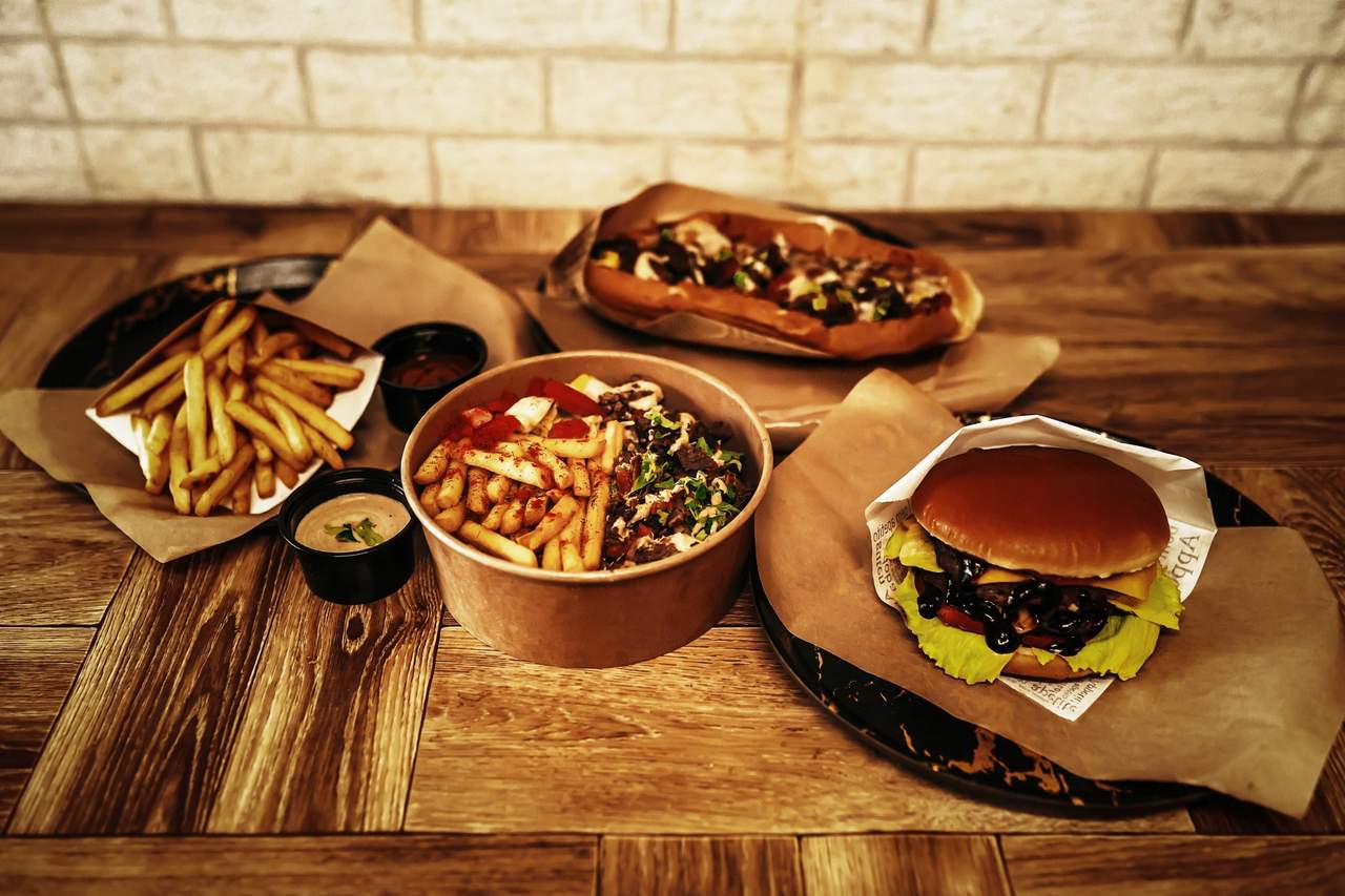 Mięso wołowe, warzywa, sos tahini - sezamowy, frytki, ser mozzarella