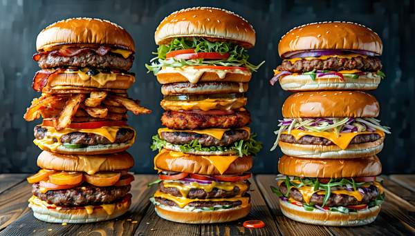 Klasyczny smash burger z wołowiną, bekonem, serem, cebulą, ogórkiem konserwowym, ketchupem i musztardą.