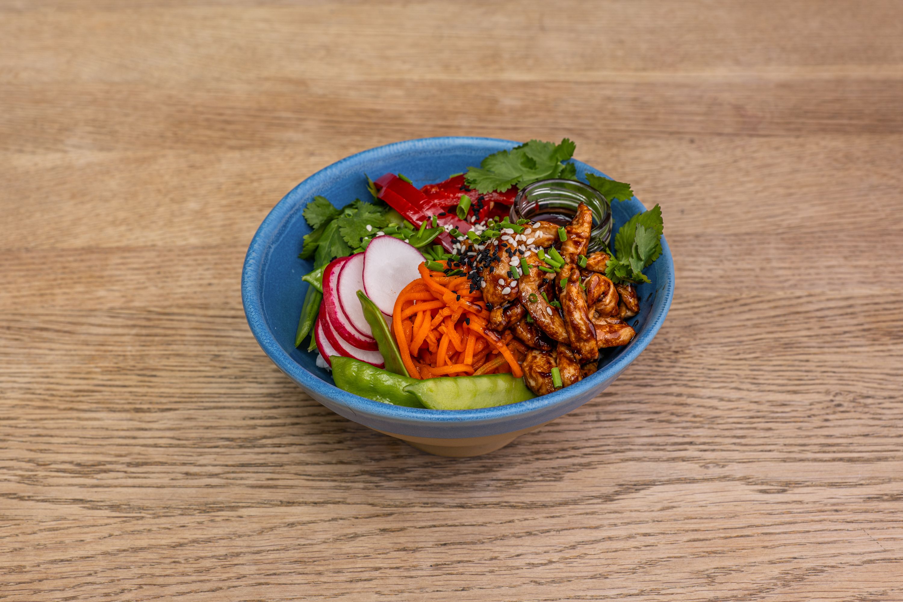 /wymień kurczaka na marynowane tofu/ w sosie Teriyaki i Gochujang, z jajkiem, marchewką kimchi, gruszką, ogórkiem, rzodkiewką, kiełkami fasoli mung, szpinakiem, sezamem, szczypiorkiem, kolendrą, ryżem do sushi i sosem sojowo-cytrusowym